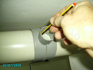 Lo primero que hago es meter un guía por el hueco hecho desde la parte superior. Por el agujero de abajo , junto al techo lo pesco. Previamente corto un trozo de tubo de unos 40 cm y se lo pego al tramo más largo con un codo de 90º.