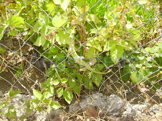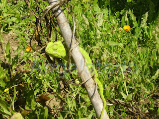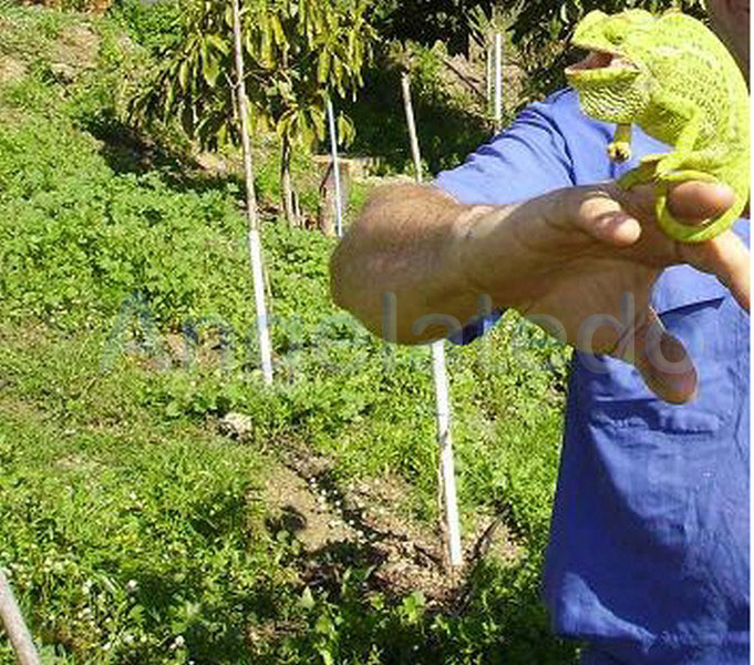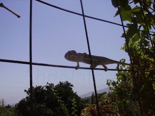 En otra ocasión me llamo la atención un ruido y movimiento de las hojas de una parra a unos veinte metros de mi siesta, me acerco y veo a un camaleón peleando con otro, (uno no tenía cola), se hinchaban en plan amenazador, resoplaban, abrían sus enormes bocas, (creo que en las peleas de camaleones está prohibido el uso de la lengua.. por eso del lengüetazo…), parecía que peleaban a muerte uno contra el otro y como se camuflan tan bien resulta que entre unas hojas junto a la pelea había un tercer camaleón un poco mas pequeño, supongo claro esta, que esta sería la hembra por la que los dos Don Juanes estaban peleando (lastima de cámara, siempre esta descargada cuando ocurre la noticia). Les deje al poco pues el vencedor se llevo a la chica y el otro ni siquiera con el rabo entre las piernas.