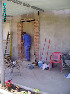 Cuando estaban todos colocados con una mezcla de cemento cola muy espesa fui tapando las ranuras, esto es un trabajo muy laborioso y además se debe tener la precaución de no manchar mucho pues luego cuesta quitar la mezcla, pues le ladrillo se lo bebe todo. En estos trabajos me ayudaron mis hijos. El remate final es ir lavando uno a uno quitándole todo el sobrante con una esponja una y otra vez hasta llegar al resultado que se ve.