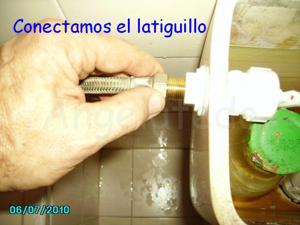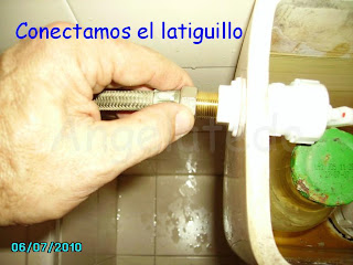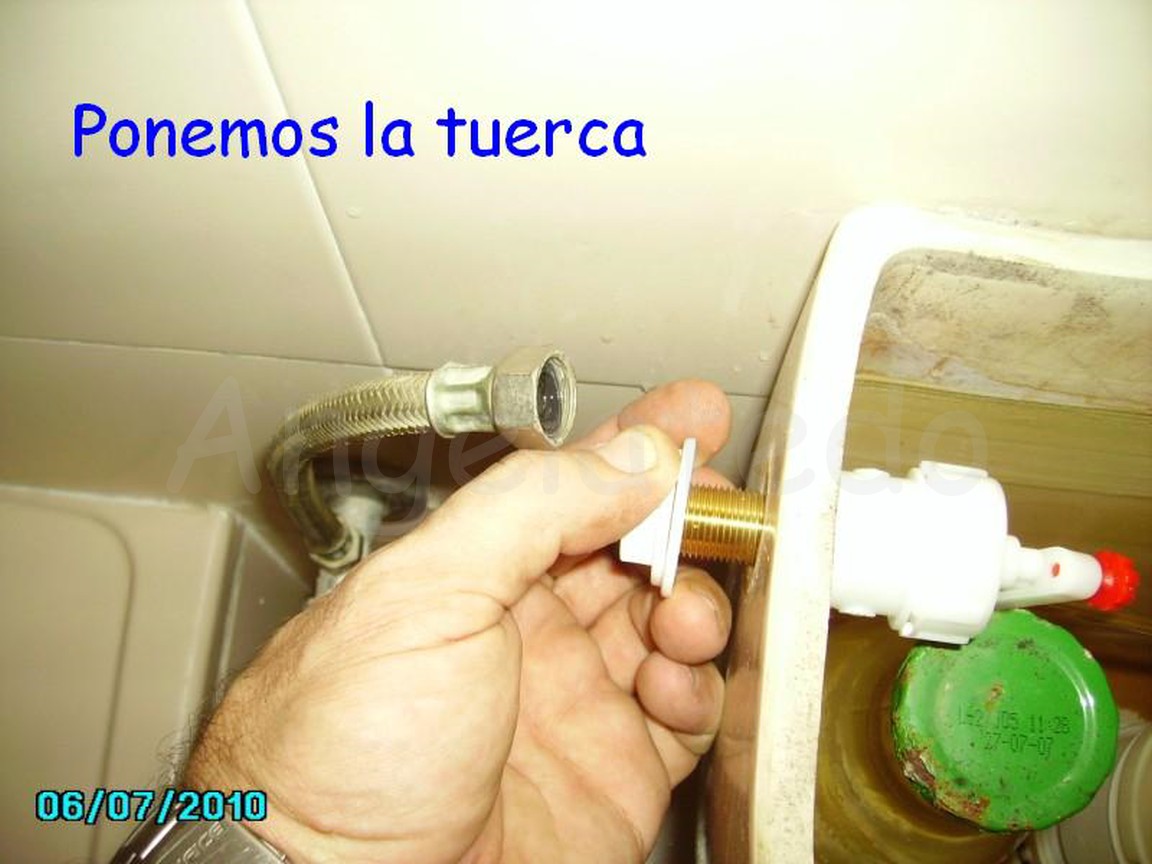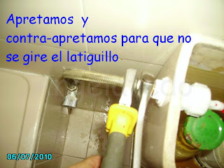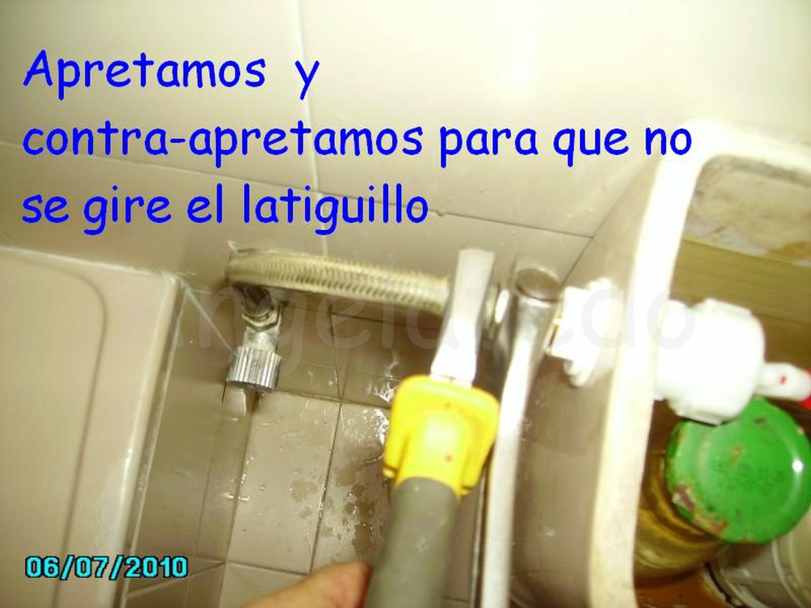 Se quita el viejo soltando la tuerca, luego con el nuevo ya montado vamos colocando la arandela, la tuerca y el latiguillo. Se va apretando todo y para que no se retuerza el latiguillo lo cogemos con la alicate mientras que con la llave inglesa apretamos la tuerca.