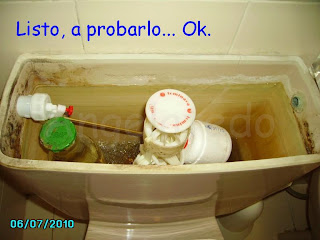 Si llenamos una botella de agua (de un litro), y la metemos dentro de la cisterna estaremos ahorrando cada vez que se actúe sobre el pulsador un litro de agua. – Hay pulsadores dobles que evacuan un poco o el total del agua…